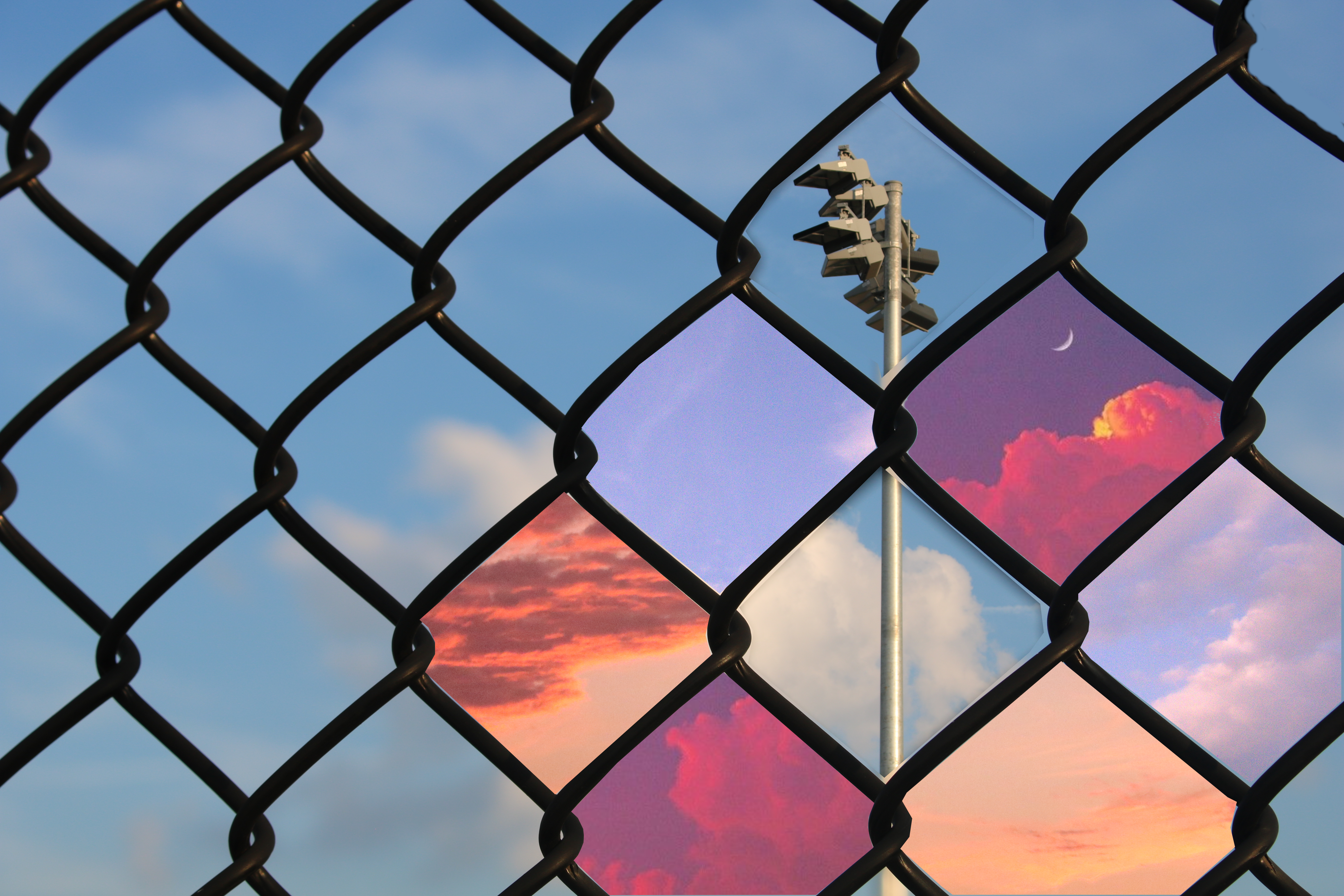 This was my final 4H photography project. I snuck into the announcer's box at the top of the football field stands and pulled down the stairs so I could get on top and take still photos of the same sky at different points in time over the course of one sunset, through the chain link fence. I like to think it creates a stained glass effect.